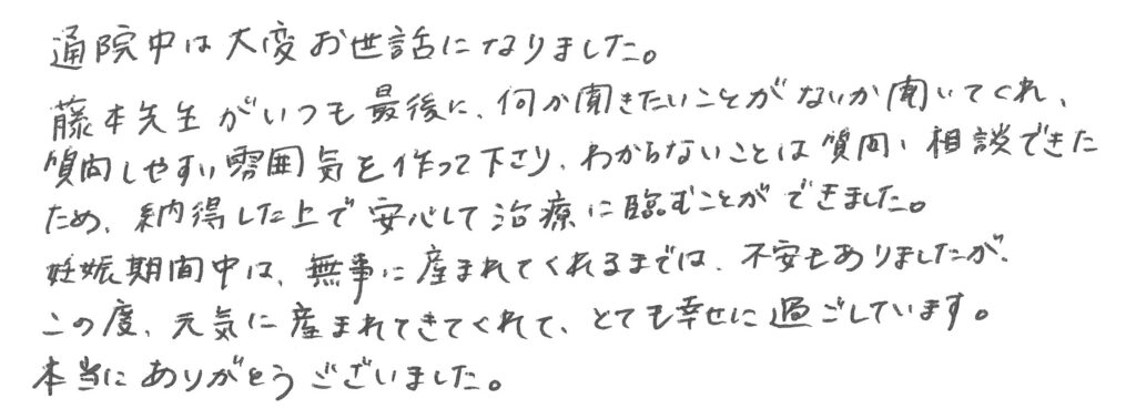 通院中は大変お世話になりました。藤本先生がいつも最後に、何か聞きたいことがないか聞いてくれ、質問しやすい雰囲気を作って下さり、わからないことは質問・相談できたため、納得したうえで安心して治療に臨むことができました。妊娠期間中は、無事に産まれてくれるまでは、不安もありましたが、この度、元気に産まれてきてくれて、とても幸せに過ごしています。本当にありがとうございました。