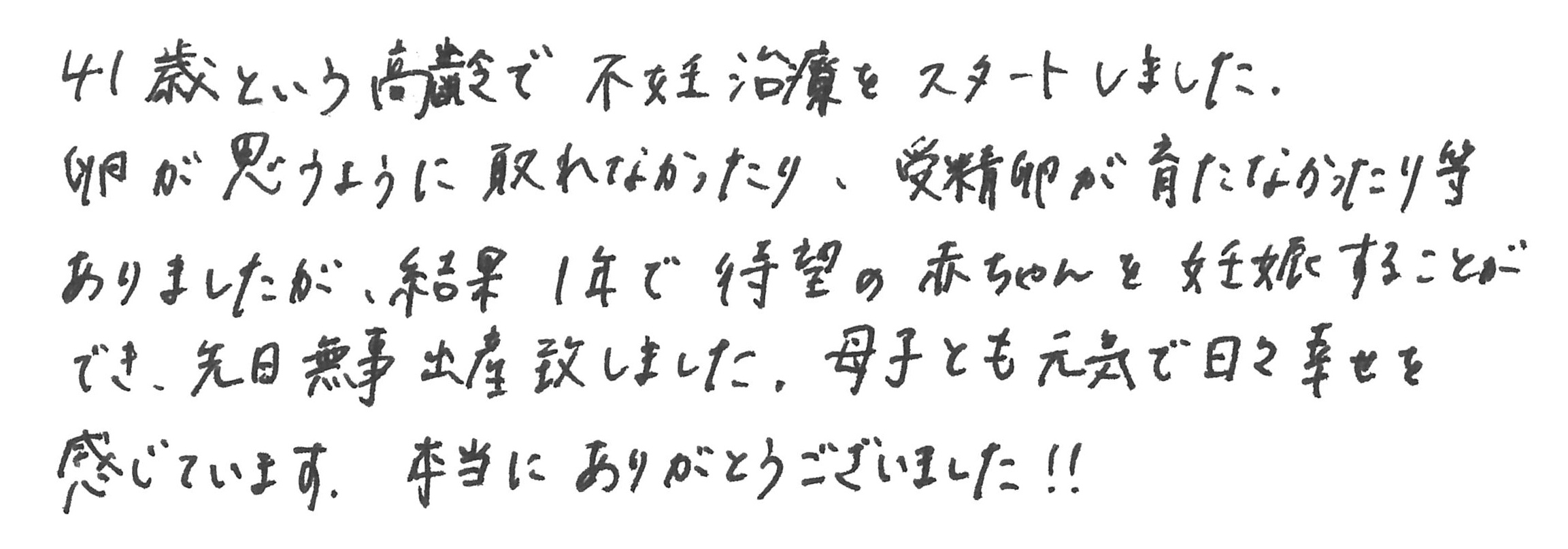 41歳という高齢で不妊治療をスタートしました。卵が思うように取れなかったり、受精卵が育たなかったり等ありましたが、結果1年で待望の赤ちゃんを妊娠することができ、先日無事に出産致しました。母子とも元気で日々幸せを感じています。本当にありがとうございました!!