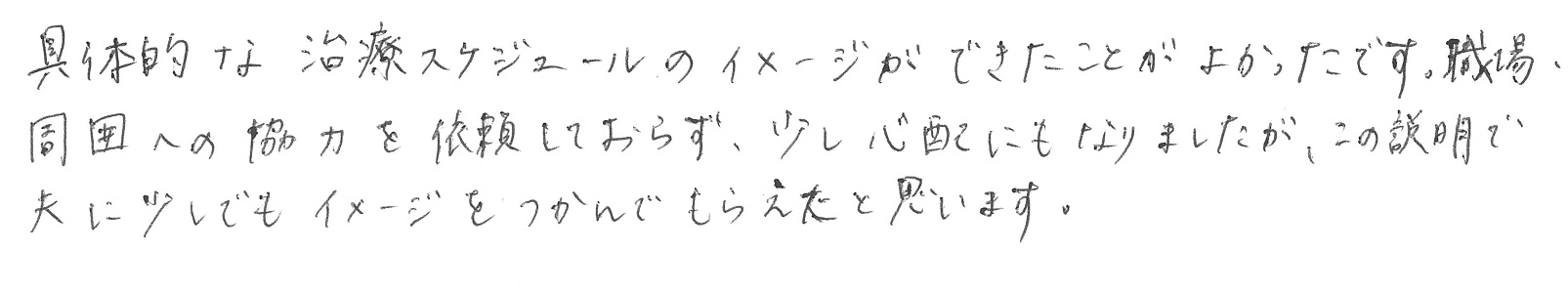 具体的な治療スケジュールのイメージができたことがよかったです。職場・周囲への協力を依頼しておらず、少し心配にもなりましたが、この説明で夫に少しでもイメージをつかんでもらえたと思います。