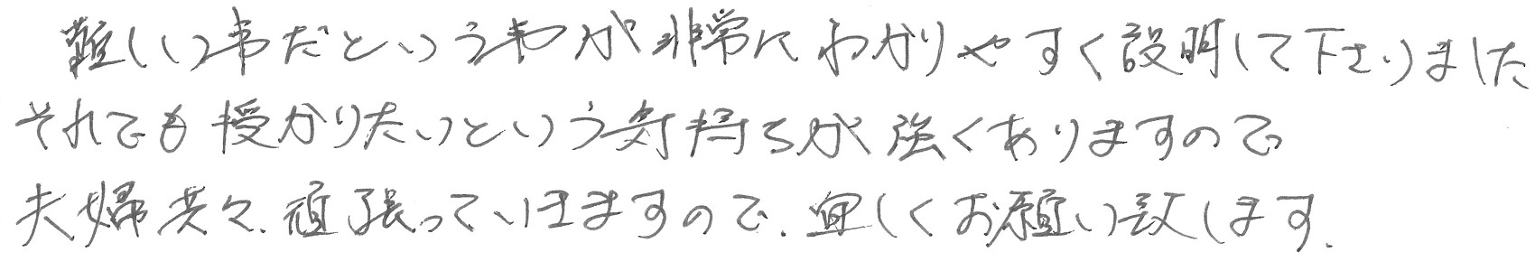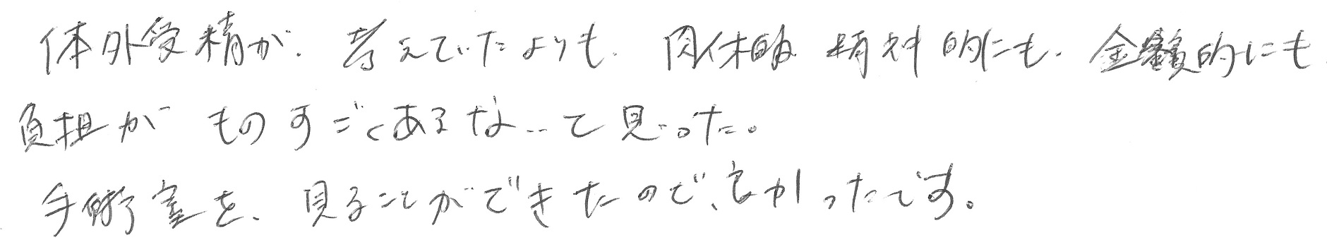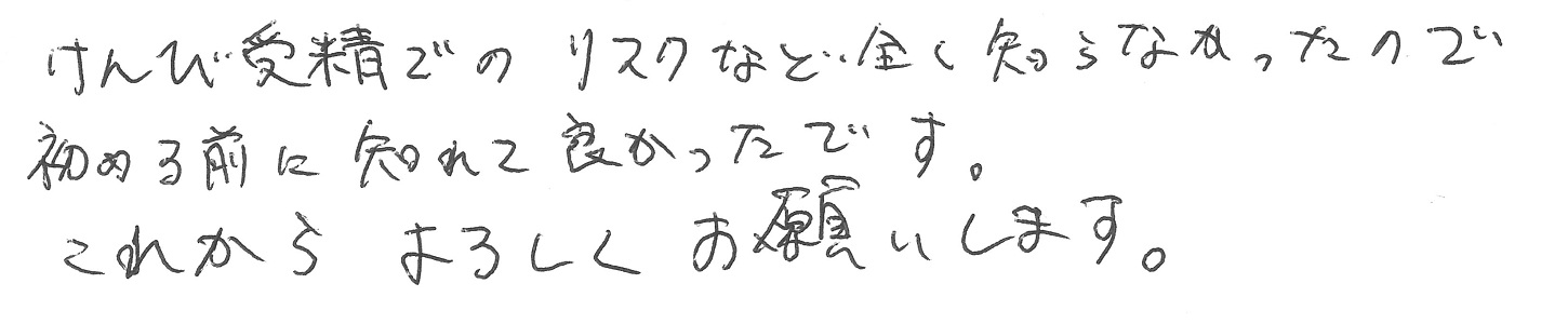 難しい事だという事が非常にわかりやすく説明してくださいました。それでも授かりたいという気持ちが強くありますので、夫婦共々、頑張っていきますので、宜しくお願い致します。