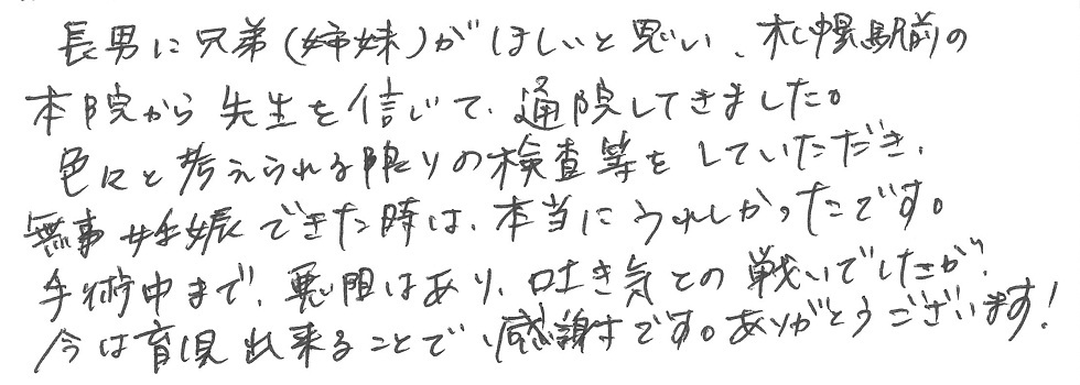 長男に兄弟(姉妹)がほしいと思い、札幌駅前の本院から先生を信じて、通院してきました。