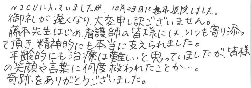 藤本先生はじめ、看護師の皆様には、いつも寄り添って頂き、精神的にも本当に支えられました。