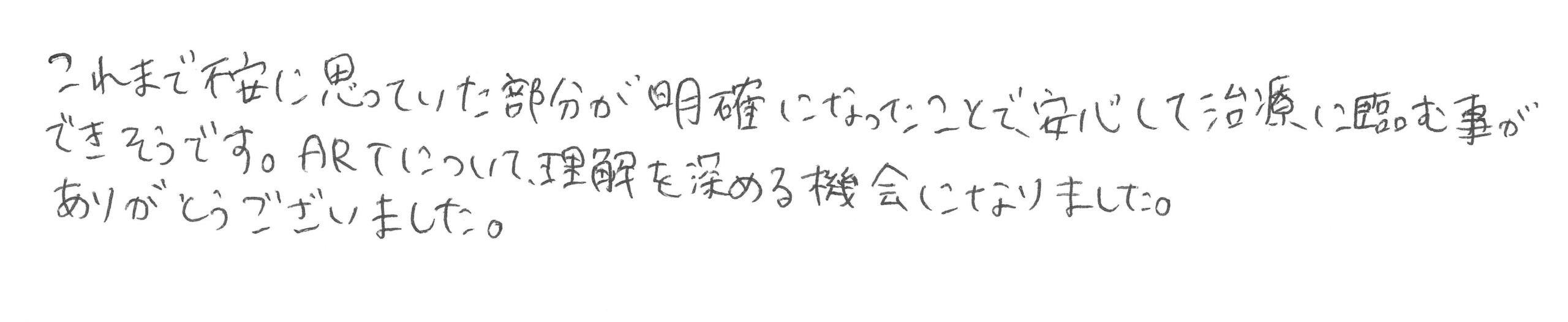 これまで不安に思っていた部分が明確になったことで安心して治療に臨む事ができそうです。ARTもついて理解を深める機会になりました。ありがとうございました。