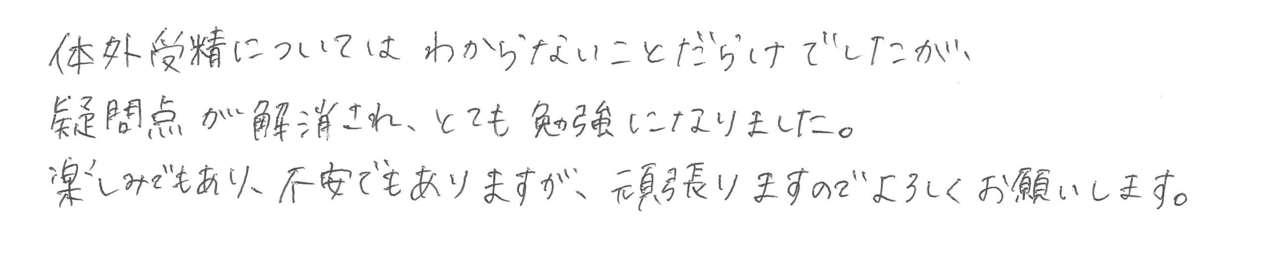 体外受精についてはわからないことだらけでしたが、疑問点が解消され、とても勉強になりました。楽しみでもあり、不安でもありますが、頑張りますのでよろしくお願いします。