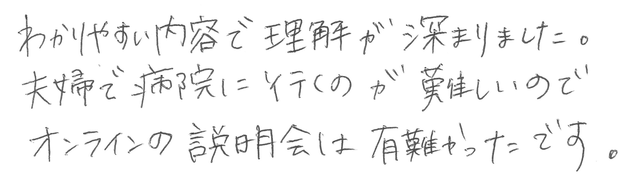 わかりやすい内容で理解が深まりました。夫婦で病院に行くのが難しいのでオンラインの説明会は有難かったです。