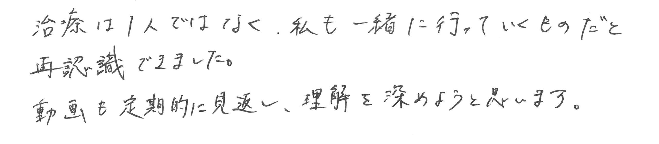 治療は1人ではなく、私も一緒に行っていくものだと再認識できました。動画を定期的に見返し、理解を深めようと思います。