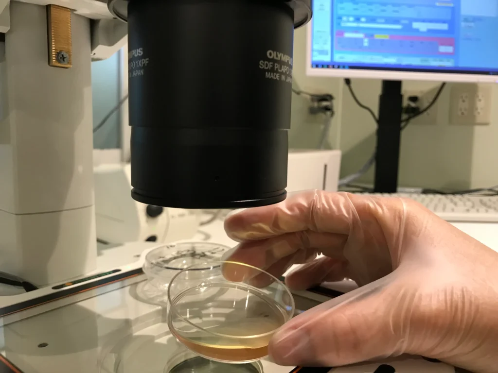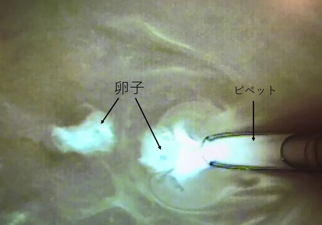 卵胞液内に卵を発見したら、細いガラス管(ピペット)で回収し、専用の培養液に移動します。