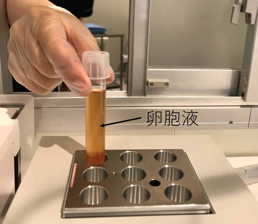 オペ室で吸引された卵胞液が入ったチューブが培養室へ渡されます。
